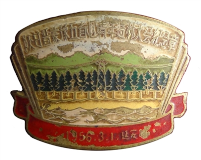 图1为陕甘晋蒙豫五省区青年造林大会纪念章,铜质,扇面造型,绘有层林叠翠的黄土高坡、微波荡漾的黄河,表达了西北五省(区)团员青年要让“赤山变绿地,黄河流清水”的期盼,上方镌主题文字,底边飘带注明会议召开时间“1956.3.1”(即1956年3月1日)和地点“延安”。
