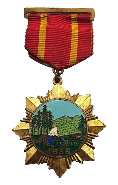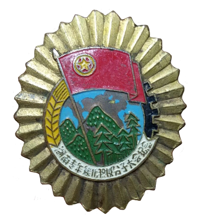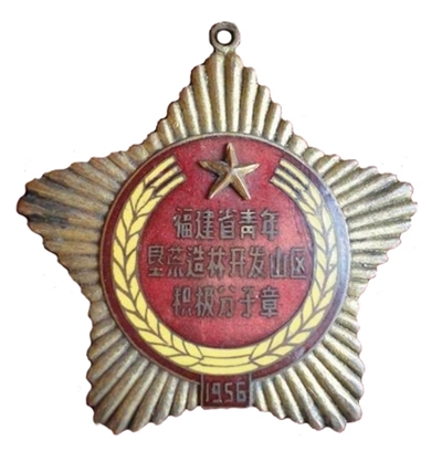图8为江西省造林积极分子大会纪念章,铜质,通径4.2厘米,1956年制发,背面铭文“江西省造林积极分子大会赠”。图9为湖南青年绿化积极分子大会纪念章,背面注明“1958”年。图10为湖南祁东共青团石山林帒突击队奖章,背面铭文“中共祁东县委赠”。图11为福建省青年垦荒造林开发山区积极分子章,1956年,背面铭文“共青团福建省委”“福州证章合作社”及三位数编号。还有枚福建省造林纪念章,1964年制,背面戳印“福州制牌厂”及编号。