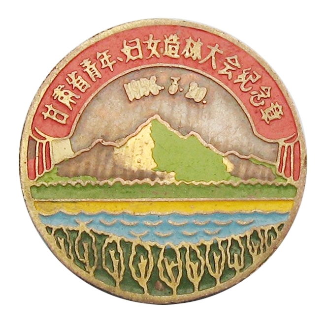 图2是甘肃省青年、妇女造林大会纪念章,铜质,直径2.7厘米,绘有黄土高原、黄河、森林图景,刻有主题文字,注明大会召开时间“1956.3.20”(即1956年3月20日)。