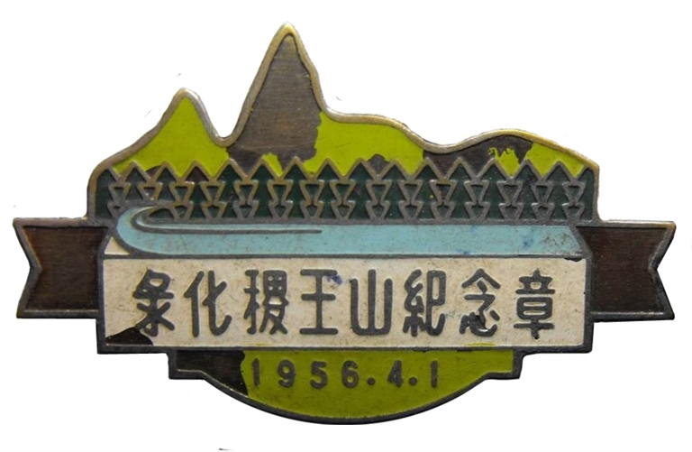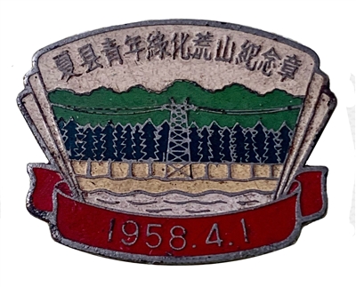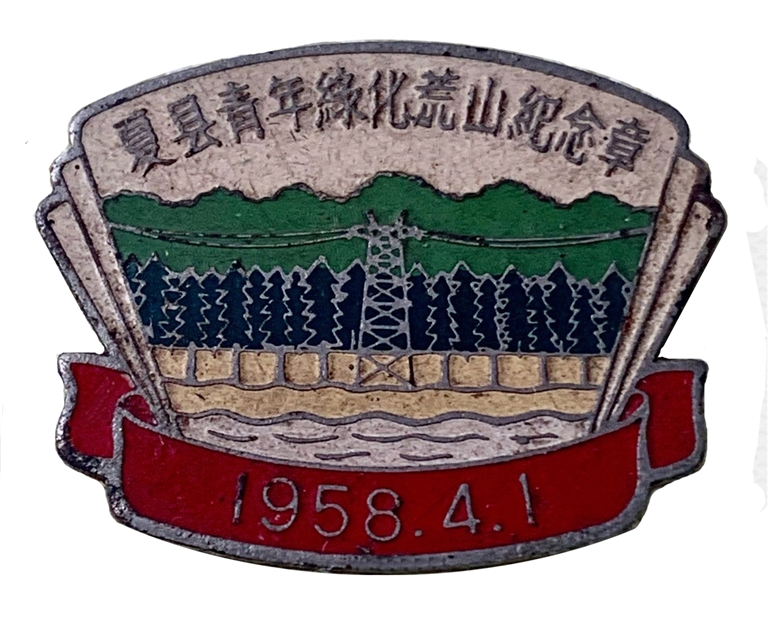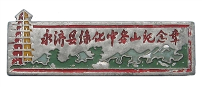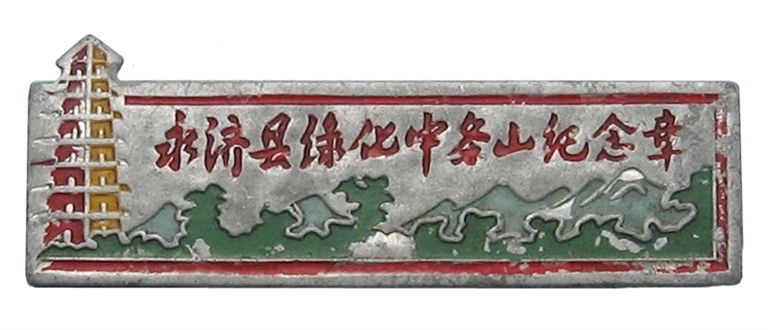 图3为绿化稷王山纪念章,铜质,尺寸4.3×2.5厘米,造型如同一幅山水画,由青山、森林和河流组成。颁发时间“1956.4.1”(即1956年4月1日)。图4为永济县绿化中条山纪念章,铝质,尺寸4.1×1.3厘米,背面注明“1958”年。图5是夏县青年绿化荒山纪念章,1958.4.1(即1958年4月1日)。
