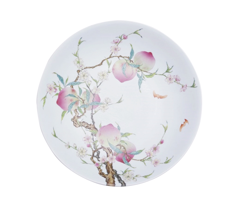 由此,笔者认为雍正“桃”瓷特点有四:一是胎质匀净细白,这跟雍正对官窑瓷器要求严谨和他个人的审美分不开。二是瓷器色彩淡雅,彩浓淡相宜,立体感强。三是瓷器桃纹构图疏密有致,画法精细纤柔,纹饰画意生动,浓、淡、明、暗阴阳相悖,栩栩如生。四是瓷器都为官窑瓷,且都有如“福寿双全”“五蝠捧寿”“八仙祝寿”“九桃献寿”等美好寓意。