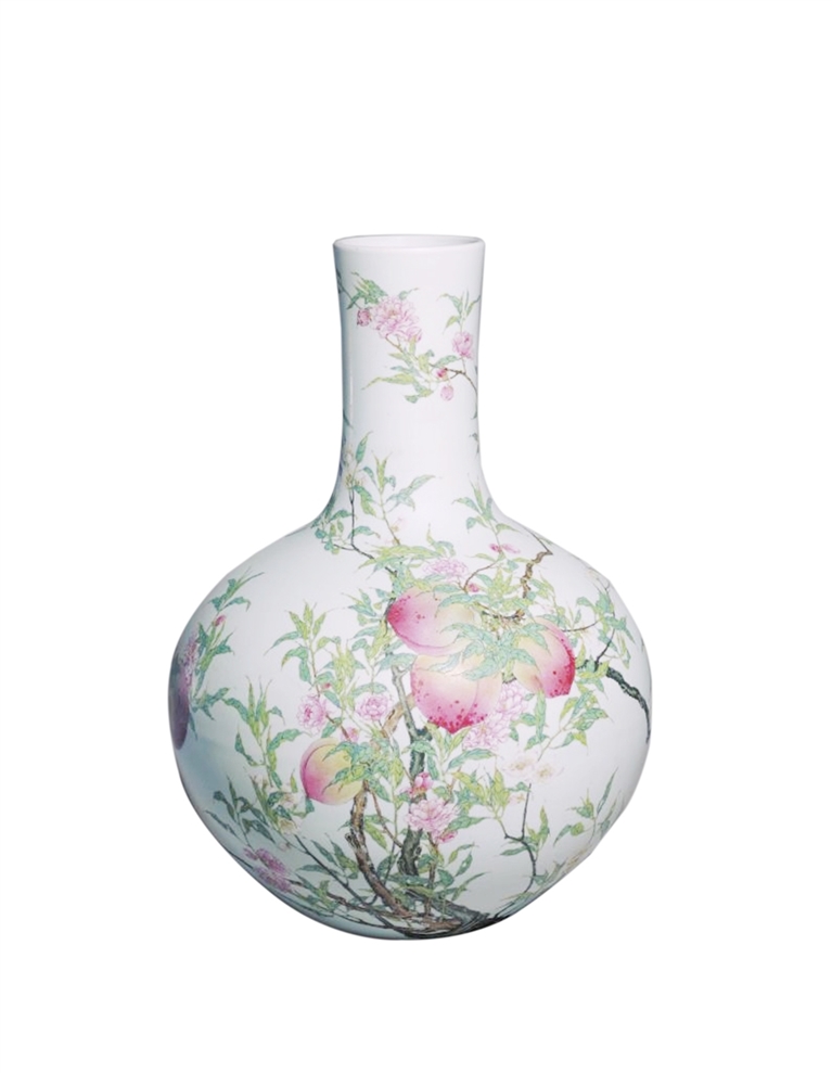 清雍正粉彩蟠桃纹天球瓶(图2),高50.6、口径11.9、足径17.7厘米;直口微撇,颈较短,浑圆腹,圈足;通体内外施白釉;圈足内施白釉,外底署青花篆书“大清雍正年制”六字三行款。瓶体上以粉彩描绘桃树一株,枝繁叶茂,自瓶底沿腹部蜿蜒而上,八颗硕大饱满的桃实压坠枝头。天球瓶以形似天体星球而得名,此种器型始见于明代永乐、宣德时期,流行于清代雍正、乾隆两朝,属于陈设用瓷。后世所制粉彩蟠桃纹天球瓶多以雍、乾时期的制品为蓝本烧造而成。雍正官窑粉彩瓷器上所绘蟠桃多绘八只桃实,而乾隆时则多绘九只桃实,因此有“雍八乾九”之说。此瓶彩绘构图疏朗有致,釉色浓淡相间,绘画精细工巧,堪称雍正官窑粉彩瓷器的代表作。