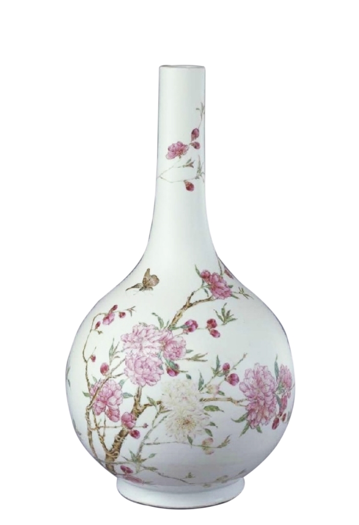 清雍正粉彩桃花纹直颈瓶(图3),高37.6、口径4.1、足径11.6厘米,直口,长颈,圆腹,圈足外撇;通体白釉,粉彩装饰,圈足内施白釉,外底署青花楷书“大清雍正年制”双行六字款,外围青花双线圈。瓶体绘桃树一株,蔓遍器身,花蕾欲放,鲜花婀娜,绿叶青翠,彩蝶飞舞其间。胭脂红彩描绘的花朵颜色深浅不同,花心部分色料最厚,从花心到花瓣边沿红色渐趋浅淡。此瓶造型优美,色彩绚丽,绘画精细入微,图案逼真,是一件颇能代表雍正粉彩瓷器烧造水平的佳作。雍正粉彩瓷以白地彩绘为主,其胎体薄轻,釉面纯净,温润似玉,可充分衬托出粉彩之娇丽。有些盘、碗类小件器物玲珑剔透,若迎光透视,另一面的图案清晰可见。雍正粉彩瓷器的装饰题材以花鸟、山水、人物图案为主,尤以花卉见长。它吸收了中国传统绘画中的“没骨”技法,突出阴阳向背,浓淡相间,层次清楚,富有立体效果。