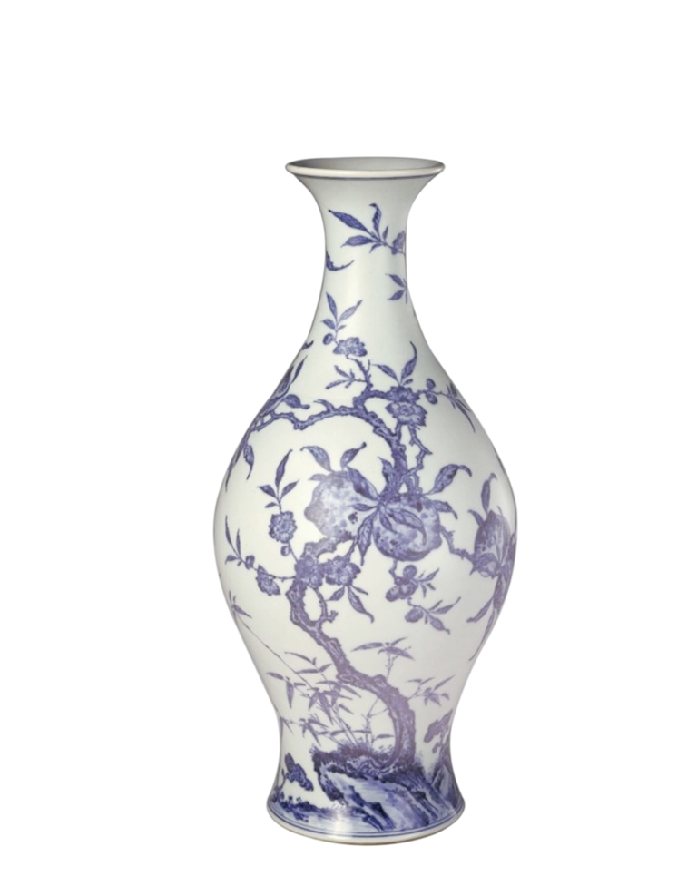 清雍正青花桃蝠纹橄榄式瓶(图4),高39.3、口径10、足径12.3厘米,撇口,细长颈,腹下渐敛,圈足外撇,口、足际各绘双弦纹一周;底足青花双圈内楷书“大清雍正年制”六字款。瓶身以桃树为主题纹饰,树上结桃实9枚、桃花20朵,树下绘灵芝、竹子,空间绘蝙蝠5只。橄榄瓶在雍正朝最为流行,有珐琅彩器、青花器、单色釉器等品种。其造型由康熙朝观音尊演变而来。此瓶青花画风仿明永乐、宣德风格,以点染的重笔模仿铁结晶斑点,于清秀中显露出古朴刚劲之风。图案中的桃实、桃花、桃枝、蝙蝠、灵芝、竹子等,在传统文化中均属于吉祥图案,寓意福寿吉祥。雍正朝官窑瓷器以造型端庄、做工精细著称。此瓶造型秀丽,纹饰构图疏密得当,工艺精巧。为雍正官窑青花瓷器中的杰出之作。