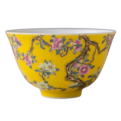 清雍正黄地珐琅彩桃花纹杯(图5),高4.5、口径7.4、足径2.8厘米;胎体轻薄,口沿外撇,盏腹弧形,圈足圆润,呈现一种高贵气质;加之杯身的黄色底色,充分彰显出皇家的非同寻常。杯内素光无纹饰,外部尽显豪华装饰。杯身黄色底一侧绘花色艳丽的桃树,中间交叉有两枝梨花。桃花鲜红开得正盛,梨花雪白,在赭色枝干、嫩绿花叶的衬托下,更显妖娆美丽,把惊蛰之后百花争艳万物争春的景致描摹得十足。杯另一侧题唐代诗人温庭筠《海榴》中的“蜡珠攒作蒂”五言诗一句,起到画龙点睛作用,让惊蛰桃李不言、风雷相搏的季候特点更加鲜明。此杯集诗、书、画、印、瓷于一体,凝结了中国人勇于借鉴、敢于创新以及孜孜以求的艺术精神。