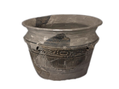 尊是大型盛酒、酿酒器。甲骨文中的“酉”字就是以大口尊为原型的象形字,“尊”字则是两手捧着大口尊的形象,而“尊”与“奠”通用,表示祭祀时献酒。这件陶大口尊的特别之处在于肩部的一周纹饰是图案化的龙纹,与商周时期的夔(kuí)龙纹颇为相似。夔龙纹即龙的侧视图案,在陶寺遗址出土的史前彩绘陶器上已出现。(王国良 整理)
