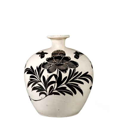 北宋磁州窑白地黑彩剔刻蝶恋花纹小口瓶(图2),高25.7厘米,中国嘉德香港2021秋拍会上,成交价740.4万港元。此器形制典雅,气质内敛,小盘口,短束颈,丰肩圆腹,腹壁向下弧收隐出圈足。圈足涩胎,见化妆土、透明釉流散。胎色浅灰,胎质坚实,瓷化程度非常高。釉面滋润,半木光,唇口白釉处有细微开片。腹部对称以黑彩绘两组折枝牡丹花,花朵之上点缀蝴蝶。牡丹花心及蝴蝶翅膀皆划篦纹,枝叶、花瓣外廓浅浅地划出轮廓线条,简约大方。整器典雅沉静,黑白对比醒目,彩绘、刻划花工艺并用,画工精湛,刻工流利,布局得体,落落大方。这种工艺要求瓷匠在胎体干燥前很短的时间内完成,并对所画内容胸有成竹,笔法娴熟,一气呵成,而要剔除黑色面层而不损白色底层显然难度要求更高,可见陶工精湛技艺。该器取材自然,寓意丰富,在白色化妆土上用黑彩借鉴中国传统绘画的手法描绘纹饰,剔刻技法犹如点睛之笔,更显得生机盎然,形成了一种具有强烈黑白对比和丰富文化内涵的装饰艺术。