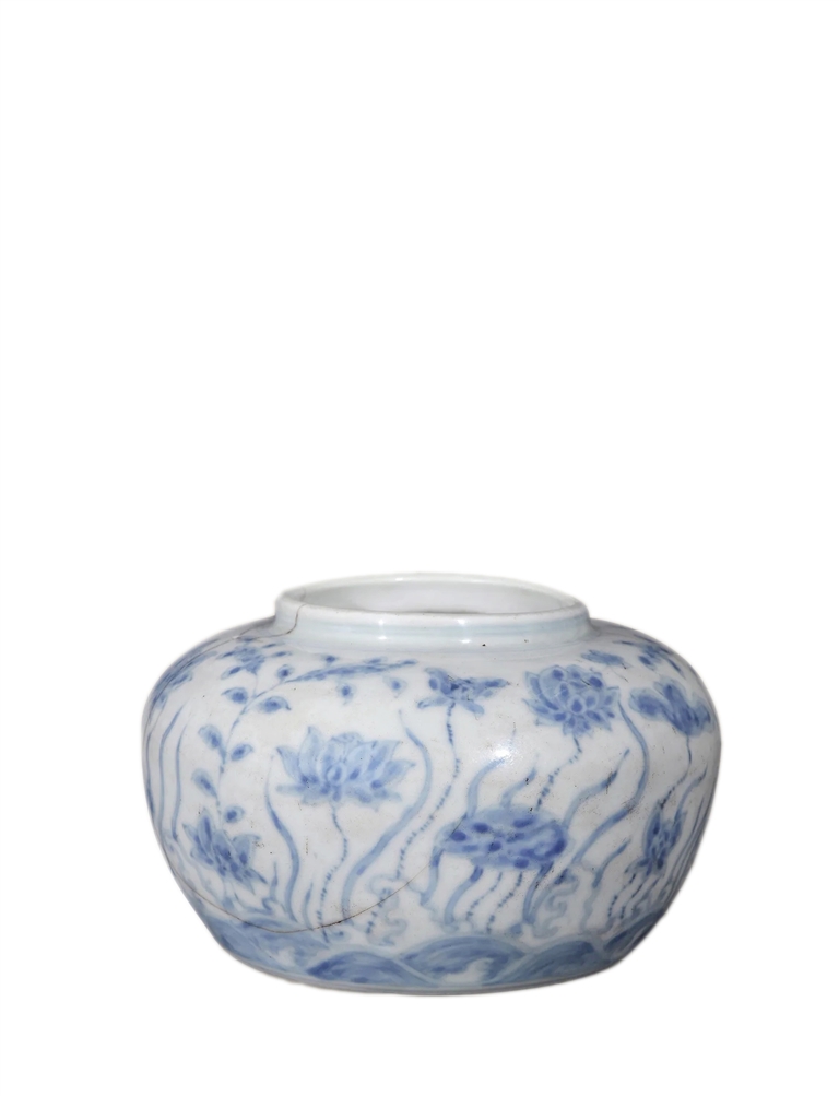 明成化青花莲池蝴蝶罐(图4),宽16.3厘米,直口、短颈、丰肩、扁圆腹、圈足。器以青花绘莲池纹,青花淡雅,有如仲夏时节莲塘波浪翻滚,莲花盛开,荷叶辅于其下,间以水草摇曳飘香,彩蝶空中飞舞。外底青花双圈内书“大明成化年制”六字两行楷书款,为典型成化时期御窑瓷器。《博物要览》评价:“成窑上品,五彩供养浅盏,草虫浅盏。青花纸薄酒盏,五彩齐箸小碟香盒……各制小罐,皆精美可人”。可见古人赞美成化青花小器之精。成化帝信佛,佛以莲花喻妙法,各种净土均称莲花藏世界,又因莲花出淤泥而不染,又有“清廉”的“廉”谐音,象征着高雅与清廉,深受文人雅士的称颂,故成化时期瓷器多见莲花纹作装饰。但出土样本与市场流通作品相较,此种成化青花罐以九秋花草图者居多,数年拍卖流通者以青花发色深沉、淡雅者皆可见,唯荷塘飞蝶纹者少见。此罐在北京保利2015春拍会上,以172.5万元成交易主。