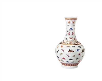 清光绪粉彩百蝶纹赏瓶(图8),高40厘米,标准赏瓶形制,以百蝶纹为主题纹饰。彩蝶依据清宫彩样绘制,间以如意云头纹、缠枝莲托寿字纹与莲瓣纹分隔。该器制作严谨,装饰效果强烈,在中国嘉德2005春拍会上,收获33万元成交价。