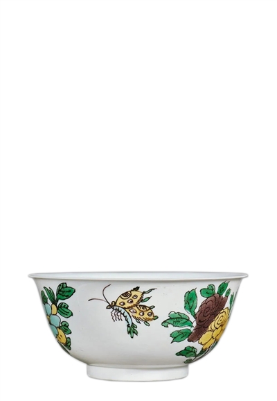 清康熙素三彩花蝶暗刻龙纹碗(图5),直径14.9厘米,撇口,深腹弧壁,圈足,碗形端正大气,其口沿外撇并略向下翻卷,足墙根部略呈弧形,为本类器物特征之一。碗胎质细腻,胎体轻薄,外壁刻画双龙赶珠纹样,其龙体矫健,龙爪锋利,昂首怒视,威风凛凛。刻画龙纹之上以黄、绿、紫等诸彩绘制折枝花卉两株,花朵饱满,枝叶繁茂,花丛之间还有两只蝴蝶飞舞穿梭,其画法生动,色彩恬静,尤其是蝴蝶及花朵上所运用的湖水绿色,宛如一汪春水,是康熙素三彩中最具代表性的颜色。碗外壁折光处还有五色蛤蜊光闪烁其间。外底双圈内青花书“大清康熙年制”六字双行楷书款,款字书写苍劲有力。此碗器型周正,胎体轻薄,纹饰刻画精细,画工流畅,色彩淡雅,刻画龙纹与彩色花蝶交相辉映,华美之中又不失威严,在2009年嘉德四季拍卖中,收获98.56万元成交价。