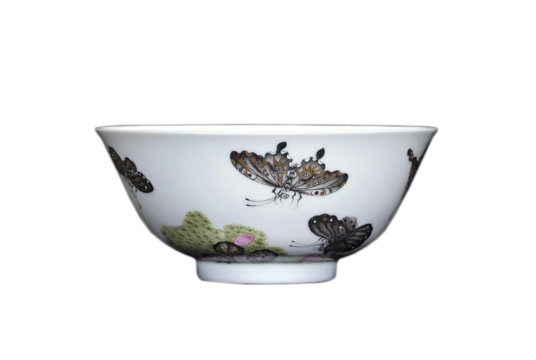 清道光粉彩花蝶纹碗(图6),直径15厘米,撇口弧腹,下承圈足,碗型规整端庄。碗内壁光素无纹,外壁描绘六只姿态各异、飞舞嬉戏的彩蝶,蝴蝶以墨彩为主色调勾绘,其上再点缀矾红、金彩,画面一隅以各色彩料装饰祥花绿草。碗外底矾红书“大清道光年制”六字三行篆书款。此碗纹饰布局疏朗,绘制笔法细腻,其装饰上的最大特点是虽采用彩蝶作为主题纹饰,却以墨彩为主色调进行描绘,从而使整个画面显得淡雅沉静。这种装饰手法与清代御窑乾隆以降崇尚重彩的风格截然不同,应是更多借鉴了雍正粉彩清新内敛之风。该器在中国嘉德香港2014年春拍会上,成交价69万港元。