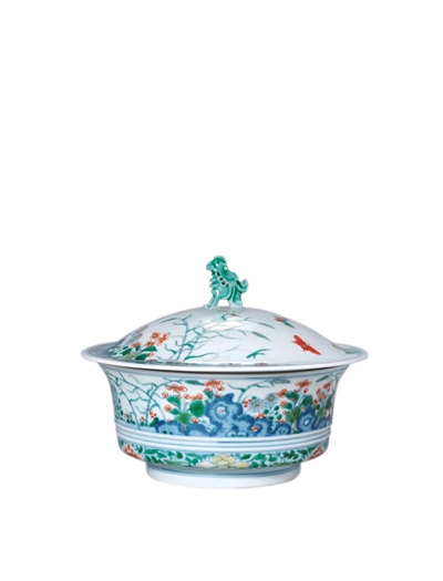 清雍正斗彩花蝶图天鸡钮盉碗(图3),直径19.3厘米,呈倒置马蹄形,侈口,斜壁内收,近足处饰凸弦纹两道,及底急内收,下承圈足。通体施透明釉,釉面润泽,外壁弦纹以上部分以斗彩通绘洞石花蝶,洞石嶙峋,各色花卉或依傍而生,或数丛独立,清新甜美,间或彩蝶翩跹,花蜂饮蜜,蟋蟀栖息禾穗之间,生趣盎然。下部绘缠枝花卉四丛,花团锦簇,明丽鲜艳,既各自成画,又相互融合。盖与碗子母口相接,外沿平整,及内隆起,中央饰天鸡钮,施绿彩,盖面以斗彩装饰洞石花蝶图,与碗外壁上半部分相呼应。整器纹饰笔法娴熟,布局有度,显示了雍正御窑无与伦比的审美格调。碗内底及盖内有“大清雍正年制”六字三行楷书款。此碗在中国嘉德2022春拍会上,以322万元成交。