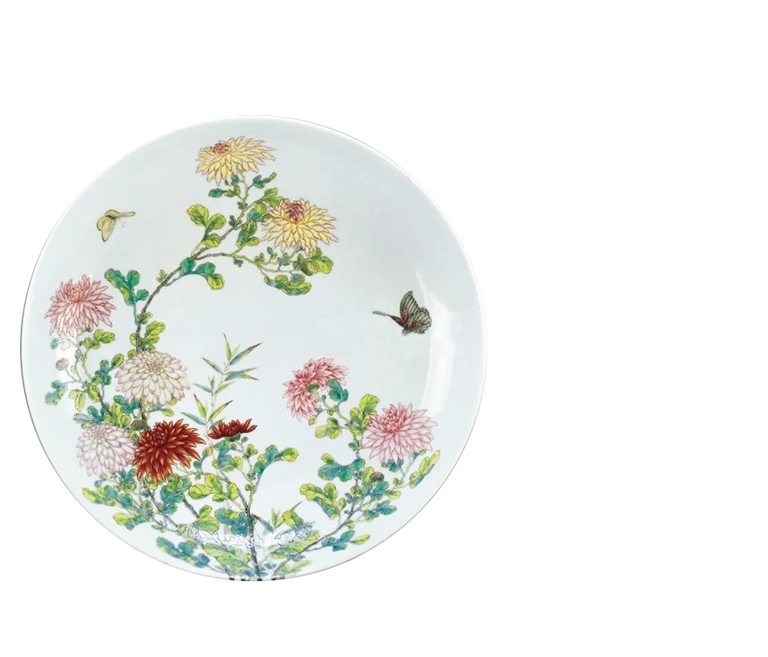 清雍正粉彩过枝菊蝶九秋盘(图1),直径26厘米,盘心以羼入玻璃白的粉红、鹅黄和呈珊瑚红色的矾红绘制九朵姿态各异的菊花,象征杞菊延年、九秋同庆的美好寓意。盘外壁亦牵连绘制数朵秋菊横敧,翠竹穿插其间。盘上双蝶飞舞,细处妙入毫颠。“蝶”谐音“耋”,取长寿之意。菊蝶相映,构成一派延年益寿、生机勃勃的景象。该器在北京保利2008秋拍会上,收获1187.2万元成交价。
