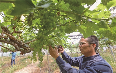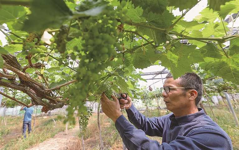 本报讯 眼下,石狮本土葡萄种植基地进入疏果期。3月29日,记者走进石狮帝茂生态农业基地阳光玫瑰葡萄园,看到大棚里成排的葡萄架井然有序,一串串青涩的果实在阳光下玲珑剔透,惹人喜爱。专业种植户正穿梭在葡萄架间,忙碌地进行疏果作业。通过合理疏果,使葡萄植株的负荷趋于合理,增加葡萄籽粒,从而达到高产稳产,提高果实品质的作用。