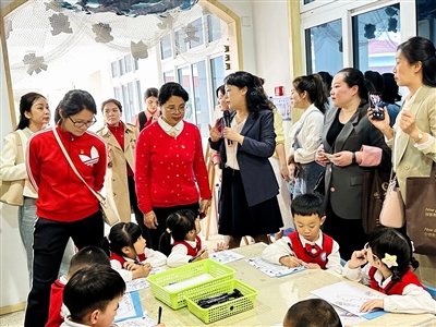 此次活动旨在进一步推动泉州市“名优校+”教育发展共同体建设,加强联动教研交流,促进共同体学校教育教学工作再上新台阶。当日上午,观摩一行在石狮市万祥实验幼儿园园长的带领下,深入校园各处感受该园多元特色的教育模式,先后参观了该园三馆两区、楼道文化、班级主题区域环境等,并与学生共同体验“渔乡探趣”户外混龄自主游戏、“趣玩紫菜”“巧织渔网”等三馆两区的特色课程,观摩一行对石狮市万祥实验幼儿园所开展的“渔悦”特色课程给予好评,对该园充分挖掘海洋文化资源,创设“融情融景”的“渔悦”校园文化环境给予充分肯定。