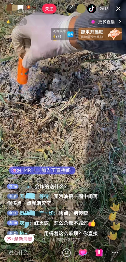 近日,一名叫“采采(化名,下同)”的网友在某直播平台上进行了一场特殊的直播活动,他采用燃放爆竹和烟花的方式摧毁红火蚁巢,以此吸引观众眼球并赚取流量。然而,这种危险且不负责任的行为不仅未能有效灭除红火蚁,反而对周边生态环境造成了潜在的危害,并多次导致主播本人被红火蚁咬伤。该直播行为迅速引发网友的广泛关注和强烈谴责,平台也在接到举报后迅速中断了直播。