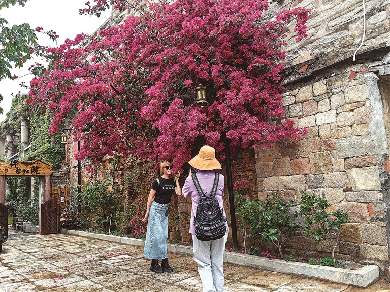 4月4日中午,清明春雨过后,永宁中街上一片盛开的三角梅,在精心打造的出砖入石古厝背景衬托下,变得格外红艳喜庆。一支从长沙来石狮游玩的旅行团行经此处,立刻被眼前的三角梅所吸引,纷纷拍照打卡。