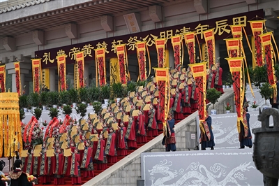 4月4日,演员在公祭轩辕黄帝典礼上的乐舞告祭环节表演。当日,甲辰(2024)年清明公祭轩辕黄帝典礼在陕西省延安市黄陵县桥山祭祀广场举行。9时50分,公祭典礼正式开始,两岸同胞、港澳同胞、海外侨胞代表共400余人参与。典礼包括九项仪程:全体肃立、击鼓鸣钟,唱《黄帝颂》,敬献花篮,恭读祭文,向轩辕黄帝像行三鞠躬礼,乐舞告祭,龙飞中华,瞻仰轩辕殿、拜谒黄帝陵,种植桥山柏。甲辰(2024)年清明公祭轩辕黄帝典礼以“铸牢中华民族共同体意识,奋进中国式现代化新征程”为主题,以“溯源、寻根、凝心、铸魂”为主旨,由陕西省人民政府、国务院台办、国务院侨办、全国侨联共同主办。(新华)