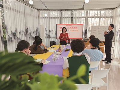 上午9时,陈以馨回到了位于巧克力花园的“宝妈你好”志愿服务团队“总部”。此时,8位社区志愿者已经在此集合,她们准备聆听从北京请来的心理专家姜春阳老师的专业培训。课堂气氛轻松活跃,大家积极探讨着社区工作中遇到的难点和问题。陈以馨与姜老师细致指导提供化解方案,帮助志愿者更好开展社区志愿服务。