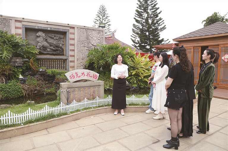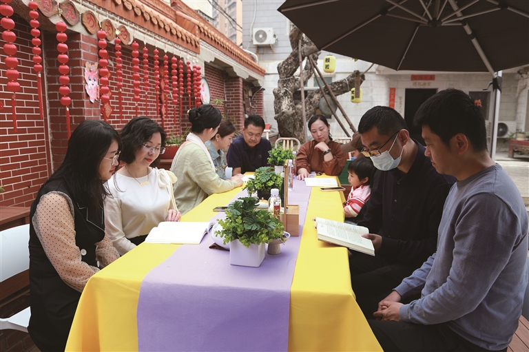午饭后,泉州、晋江的几位宝妈也慕名而来,她们希望了解“宝妈你好”的志愿服务工作。陈以馨首先热情地引领大家参观了巧克力花园,向大家介绍了墙壁上“缩小版”狮雕的由来以及背后所蕴藏的历代石狮人勇于拼搏的精神品质。她希望宝妈们能够在家庭中积极做好孩子的教育工作,将石狮人的这种优秀精神品质传承好、发扬好。随后,大家在庭院中开展了一场别开生面的家庭教育指导师茶话会。陈以馨和大家共同交流了妈妈在维系家庭和睦及社会和谐中的重要性,她的发言引起了在场宝妈们的共鸣和深思。