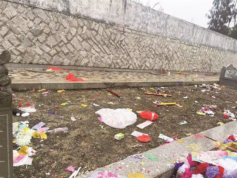 当然也有不文明的存在,笔者走访时发现不少家属将祭奠完的包装袋、纸钱、元宝随意丢弃在公墓周围的空地上。 清明的本质是扫墓祭祀、缅怀先祖,这样随意丢弃垃圾是否与我们扫墓的主题相违背。(蔡冰冰)