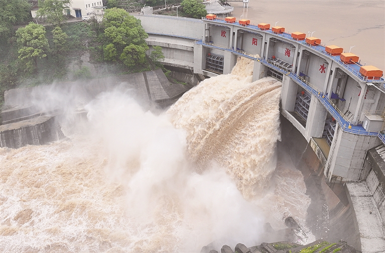 4月8日拍摄的欧阳海水库开闸泄洪的场景(无人机照片)。受强降雨和上游来水影响,湖南省郴州市桂阳县境内河流、水库水位持续上涨,湖南省衡阳水文水资源勘测中心4月8日升级发布洪水黄色预警,湘江一级支流舂陵水欧阳海水文站出现超警戒水位,欧阳海水库适时实施开闸泄洪。(新华)