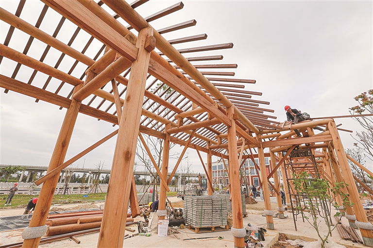 4月9日下午,记者在现场看到,朴树、乌桕、羊蹄甲等乔灌木和地被组合,绿化已大面积栽种到位。安装上路缘石、铺上水泥混凝土垫层后,区间慢道也显现出雏形。现场,施工人员正有序推进一座休闲廊架的木质主体结构安装。不久后,这一城市“门户”即可焕发新颜。