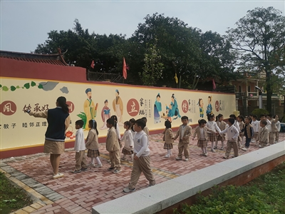 4月8日,记者从海城路走进金埭村,原本入村道路两侧约2亩的荒地上,堆积如山的各类垃圾不见了,4个不同功能区的民生公益服务综合体项目“拔地而起”。在道路的东侧,一座融入闽南特色的仿古造型村标让人眼前一亮,与之相呼应的是相邻的“闽侨文化”传习基地。以竹篱笆为背景墙的华侨名人古民居展示区,以图片的形式展示了金埭侨村的番仔楼和闽南古大厝的深厚底蕴。目前灯光投射景观也已完工,夜间景致更怡人。穿过基地,记者来到了集休闲健身、绿色游园、社区宣传为一体,以弘扬中华传统美德为主题的“家风家训”口袋公园。此时正值下午课外活动时间,金埭村中心幼儿园的老师们带着中三班的小朋友步行到此处,讲解中国优秀传统文化和社会主义核心价值观。园长董雅诗高兴地告诉记者,“家校育人”,这座“家风家训”口袋公园是村民、更是孩子们美育的传习基地。