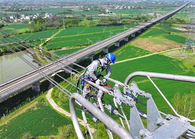 4月9日,在位于安徽省合肥市庐江县郭河镇的直流±800千伏建苏线3418号杆塔处,国网合肥供电公司工人进行高空检修作业(无人机照片)。4月4日至4月15日,直流±800千伏建苏线开展年度检修工作。通过本次全面检修,将进一步提升建苏线的供电可靠性。 直流±800千伏建苏线是我国“西电东送”大通道之一,全长2080公里,途经四川、重庆、湖北、安徽、江苏5省市,每年可为江苏输送清洁电能超300亿千瓦时。(新华)