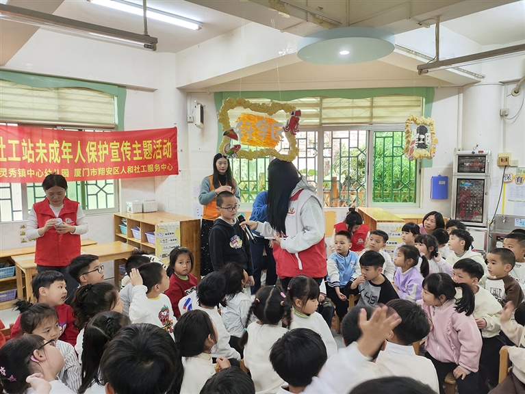 值得一提的是,此次活动也是石狮市“福蕾行动计划”项目灵秀镇示范点日常活动的延伸。今年,石狮市在原来2个示范点的基础上,在灵秀镇等乡镇设立4个新的项目示范点,推动“福蕾行动计划”与各辖区未成年人保护工作站建设衔接。同时,从3月12日起,推出免费“四点半&周末”公益课堂服务,其课程便涵盖了安全常识宣传、身心健康教育等内容。此次将宣讲活动延伸到辖区校园,“初衷是一样的,希望强化包括学校在内的各界积极参与,共同为未成年人健康成长营造一个良好的环境。”该负责人介绍。图为未保宣传活动现场(记者 康清辉)