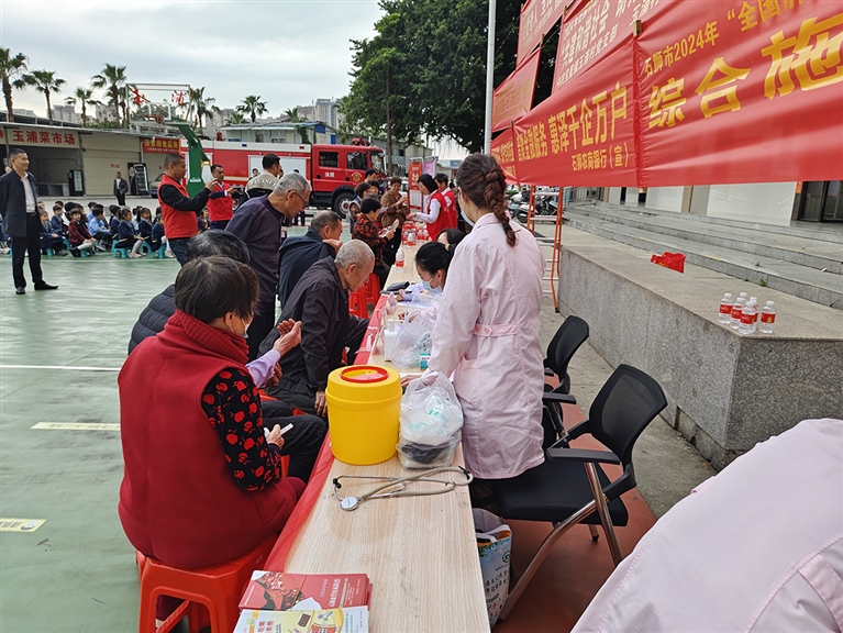 本报讯 4月10日下午,宝盖镇玉浦村篮球场上热闹不已,该村联合多个单位,开展集中宣传服务行动,并组织老年人健康体检,吸引了众多村民前往参与。