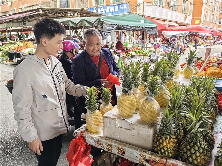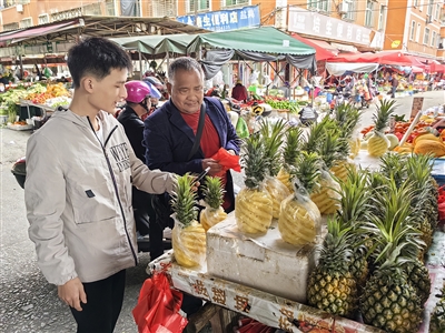 随着春暖花开,应季水果菠萝在各大水果市场大放异彩,成为市民争相选购的热门商品。4月9日下午,记者走访玉湖果蔬批发市场发现,无论是水果店内还是路边摊点,新鲜可口的菠萝都非常热销。