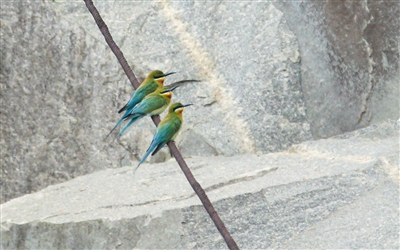 清脆的鸣叫、艳丽的翅膀、矫健的身姿……连日来,本报记者、观鸟爱好者多次探访峡谷旅游路栗喉蜂虎繁殖地,记录下今年到访的这批栗喉蜂虎影像。或许是时节未到,栗喉蜂虎尚未大批到达峡谷旅游路,目前记录到的仅有10余只,并且大多是在空中盘旋、枝头休憩,或在石窟崖壁处停歇,尚处于休整、选址阶段。因此,今年栗喉蜂虎到石狮“安家”的数量还有待观察。