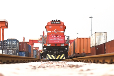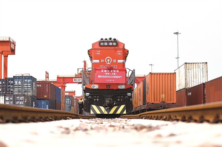 4月11日,在国铁集团郑州局圃田站,首趟中老铁路(郑州—万象)国际货运列车在做发车前准备。当日,随着满载机械零配件、陶瓷玻璃制品、纱布、冰柜、洗衣机等45个集装箱的80031次货运列车从国铁集团郑州局圃田站发出,标志着首趟中老铁路(郑州—万象)国际货运列车正式按图运行。据了解,中老铁路(郑州—万象)国际货运列车实行一周3列按图开行,平均运行6天。 (新华)