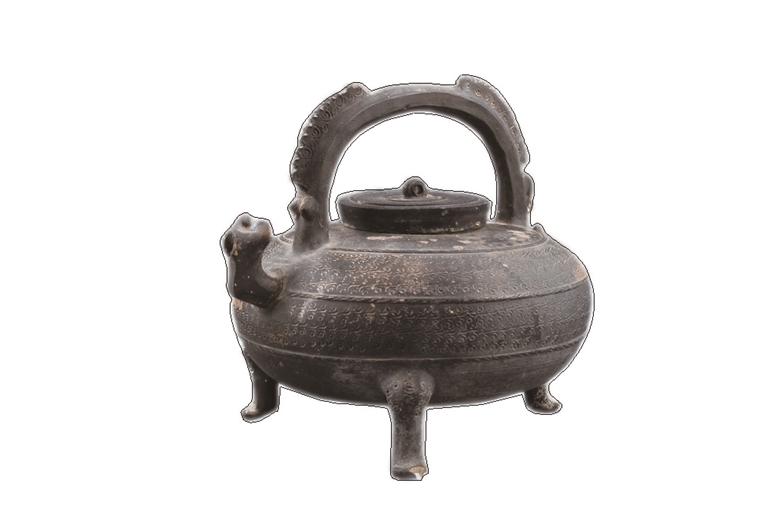 东周云雷纹兽首提梁黑陶盉(见图),通高19.8、口径7.2、足高5厘米,重1.57千克,1979年贵溪渔塘水岩出土,现藏于江西省博物馆。 盉本为商周青铜器中的酒器。这件黑陶盉仿自外形相似的青铜盉,表面乌黑发亮,是仿铜器之珍品。像这样腹部扁圆,带有兽首提梁的青铜盉流行于春秋晚期到战国时期的中原和两湖地区。(王国良 整理)