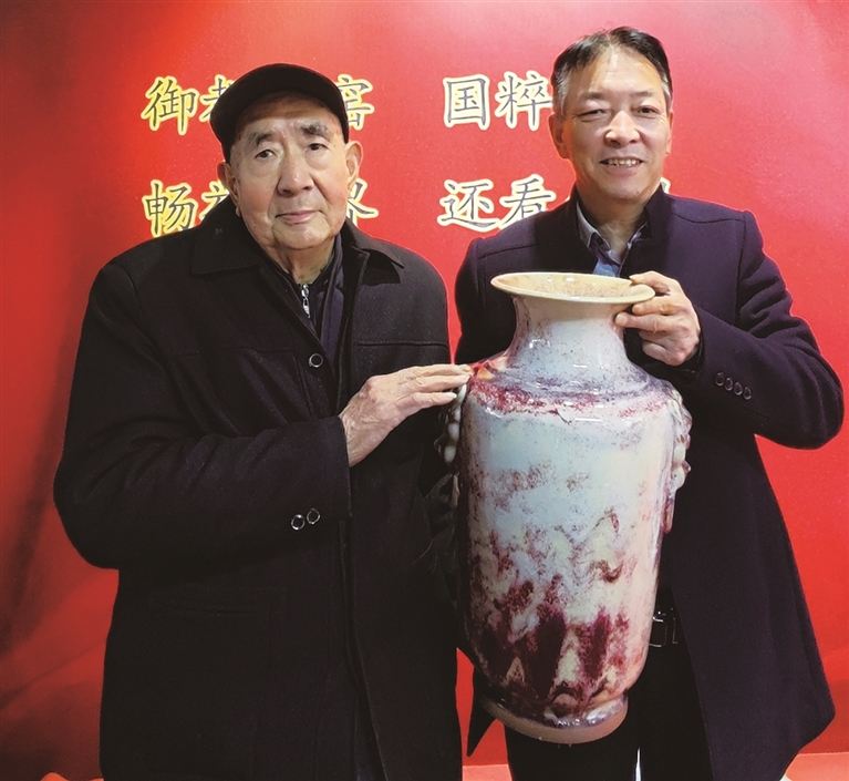 朱向前董事长将御都钧窑钧瓷作品赠予中国陶瓷艺术终身成就奖获得者、《钧瓷志》《钧窑考》编者苗锡锦(右)