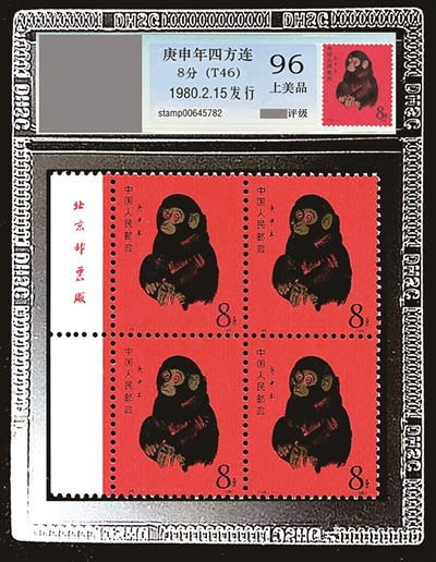 笔者接过老K已评级封装的T46金猴邮票四方联,这是一件经国内有知名度的某评级机用硬塑套封装,评了96分的T46金猴邮票四方联(图1)。