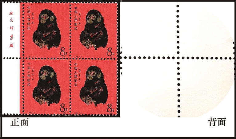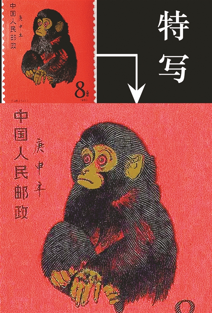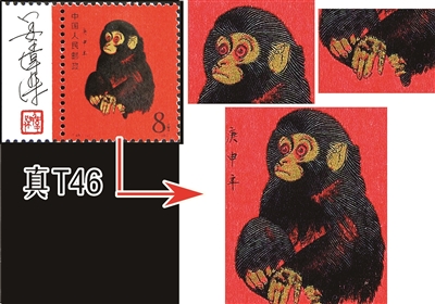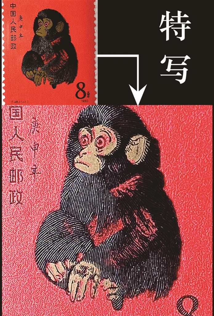 笔者仅一眼就认定:这件评96分的T46金猴邮票四方联是高仿假货,结论的理由是版别不对,真T46金猴邮票是影雕(图3),而这件T46金猴邮票是胶雕(图4)。