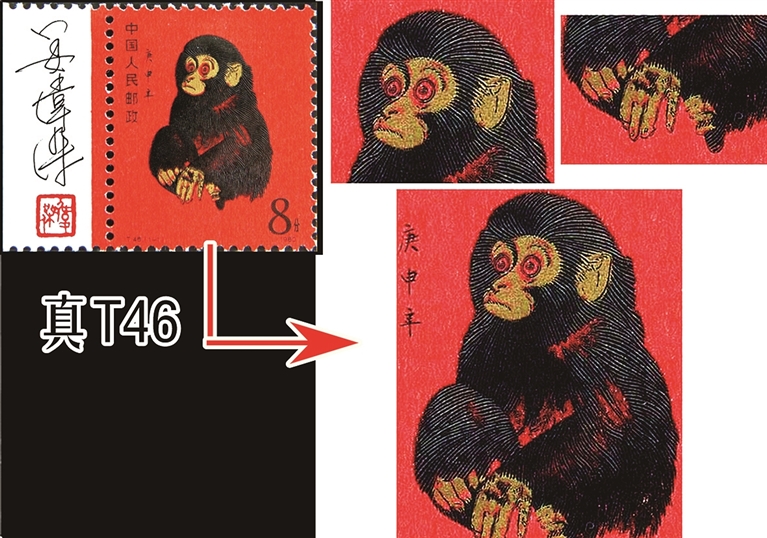 通过真假之间的版别网点比对,真T46影雕的凹版网点特征明显,既可以看到雕刻的线条效果,又可以看到影写版浅色网点空心的特点。而这件送鉴定的T46庚申年胶雕版实物,胶雕两种版的网点特征同样明显,不但雕刻版的线条的效果明显,而且胶印版的实心网点特征一目了然。