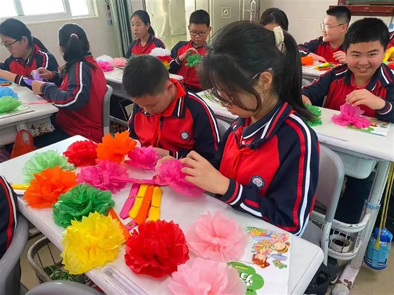 “折、捆、展开、整理……”一张张皱纹纸在孩子们的手中变成一朵朵纸花。他们时而认真折纸,时而开心交流,尽情享受着折纸花带来的乐趣。