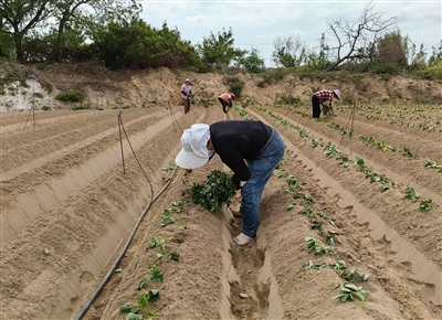 记者在现场看到,一组工人正沿着整齐划一的地垄铺设喷灌管线。这些管线如同农田的“血脉”,将水资源精准地输送给地瓜秧苗,实现了水资源的最大化利用。这种节水灌溉方式不仅提高了灌溉效率,减少了水资源的浪费,还有助于保持土壤湿度,为地瓜秧苗的生长创造良好的环境。与此同时,另一组工人则在田间忙碌地进行插地瓜秧苗作业。他们手法熟练,一株株嫩绿的秧苗在他们的手中迅速扎根于土壤之中。据这块田地的主人陈先生介绍,此次种下的地瓜秧苗,预计到六七月份就将迎来收获期,届时将进一步丰富我市的“菜篮子”。