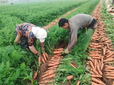 13日上午,记者在前埔村胡萝卜种植基地看到,一垄垄胡萝卜苗在田间绵延铺展,犹如一张绿地毯,与湛蓝的天空融为一体,分外赏心悦目。田间,工人们正在把一个个色泽鲜艳的胡萝卜从泥土中拔出,整齐地码放在田垄中间,再去缨、分拣、装袋。据该基地负责人介绍,该基地面积20亩,从2023年起种植胡萝卜。今年亩产量约9吨,每吨销售400元,每亩收入约3000元。
