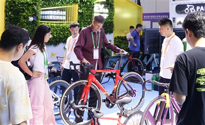 4月14日,观众在参观泰山体育展出的碳纤维自行车。第四届中国国际消费品博览会于4月13日至4月18日在海南省举行。本届消博会重点打造的国货特色潮品展区覆盖6、7、8号馆,展出各地国货潮品、老字号及“中国智造”品牌,涵盖衣食住行、娱乐等多个领域。除国货特色潮品展区外,其他展馆也展出众多国货精品,尽显国货风采。(新华)