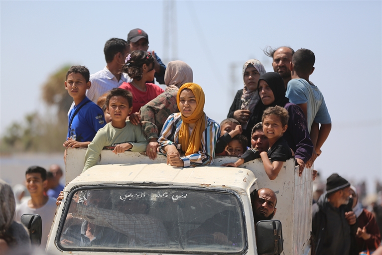 这是4月14日在加沙地带拉希德路中部路段拍摄的向北返家的人群。巴勒斯坦加沙地带消息人士14日告诉新华社记者,以色列军队当天允许部分巴勒斯坦人返回加沙地带北部地区。(新华)