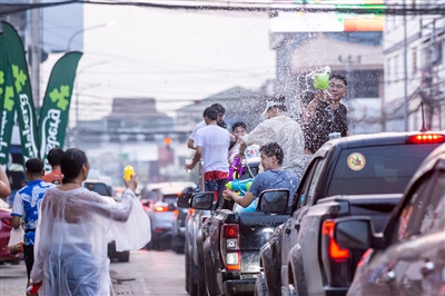 4月13日,在老挝首都万象,人们在街头参加泼水节庆祝活动。4月13日至18日,老挝迎来一年一度的泼水节。泼水节也称宋干节,是老挝的传统新年。(新华)