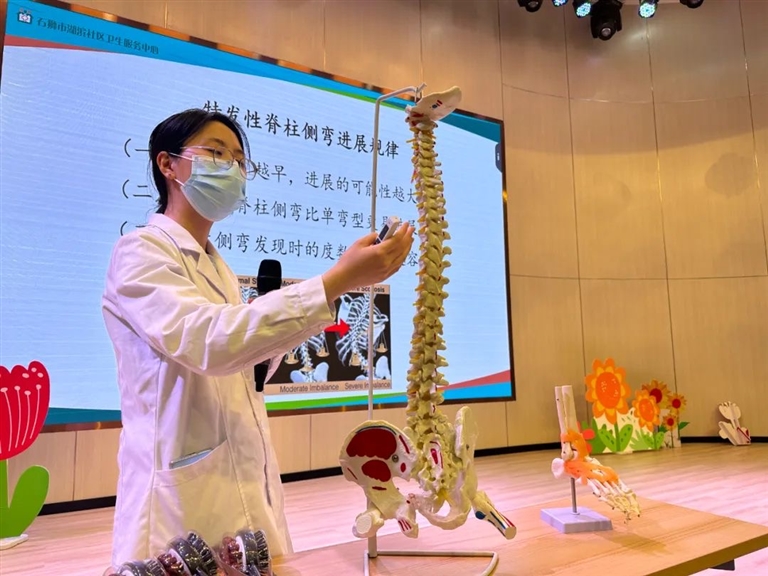 活动中,该中心康复科医生李桂讲解“脊柱侧弯”保健知识。据悉。脊柱侧弯是一种严重影响孩子骨骼正常发育的躯体畸形疾病,日常中,家长应注意观察儿童生长发育状况和趋势,如:双肩是否等高、双肩胛下角是否在同一平面、两侧腰凹是否对称、两侧髂嵴是否等高、棘突连线是否偏离中线等,早期发现并消除不利于儿童生长发育的危险因素。