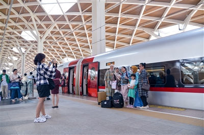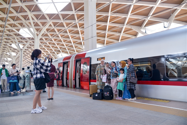 4月17日,在印度尼西亚雅加达哈利姆站站台,乘客和一列雅万高铁高速动车组合影。 雅万高铁17日正式开通运营满半年,累计发送旅客256万人次,客流呈现强劲增长态势。据中国铁路国际有限公司数据,自2023年10月17日开通运营以来,雅万高铁已安全运营6个月,共开行动车组7050列,安全运行超126万公里。 (新华)