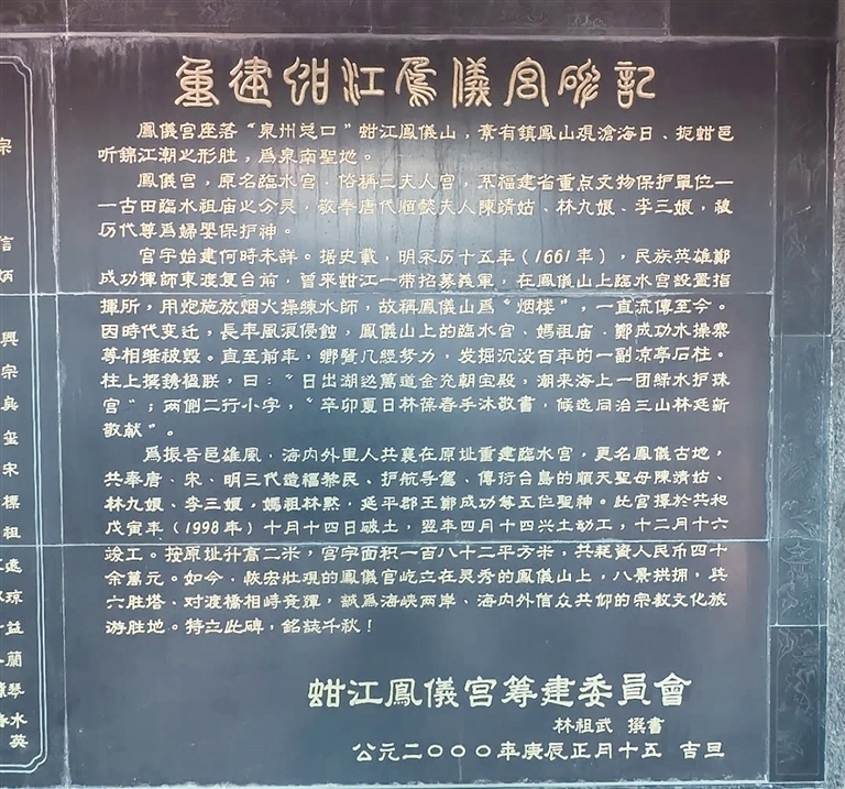 据了解,当年郑成功北伐回师后,荷兰通事何延斌投奔郑军,献上台湾地图,恳请郑成功早日率师东征复台,拯救处于水深火热之中的台胞。郑成功欣然应允,精心策划在蚶江一带招募水军,并在蚶江凤仪山设置指挥台——郑成功水操寨,人们将之称为“国姓寨”,用炮放烟火,指挥屯守在蚶江、石湖之间海面上的水师操练。从此,人们便将凤仪山称为“烟楼”,一直流传至今。凤仪宫内还有副对联:“历观对渡千帆影,曾顾复台百练师。”描绘了蚶江作为闽台对渡通商口岸、郑成功收复台湾前水师操练基地的盛景。
