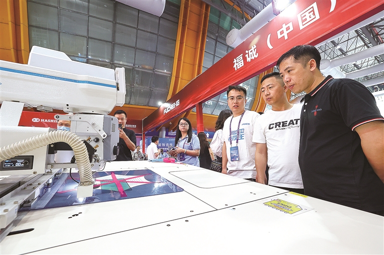 4月18日,记者在该馆内看到,参展商们带来的先进缝纫设备种类繁多、琳琅满目,处处体现出当下最新科技的力量。这些智能制造设备包括自动化电脑绣花机、高精度裁剪系统、全自动激光开袋机、新一代智能缝纫机、智能吊挂系统等,属于当前服装行业的先进设备和技术。同时,参展商还带来了针对休闲男装、裤业、童装、户外等服装细分领域的智能生产整体解决方案。可以说,“智能智造馆”为业界提供了一个了解缝纫设备发展新趋势、寻找商业机会和设备采购的良好平台。