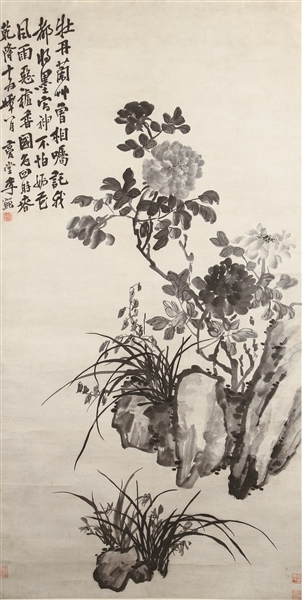 唐代诗人刘禹锡诗云:“唯有牡丹真国色,花开时节动京城。”暮春时节,牡丹吐艳,丽压群芳。画家钟情于自然美景,对“国色天香”的牡丹花自然多有偏爱。作为“扬州八怪”之一的画家李鱓,一生创作了许多以牡丹为题材的画作。“梅兰竹菊”在中国传统文化中有着特殊的象征意义。李鱓又经常将牡丹和松树、兰花同题创作,别有情趣,自成风格。